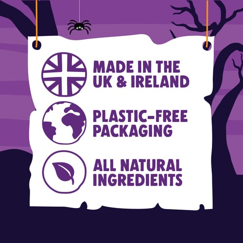 Pumpkin Jack O’ Lantern: Chickpea Flour, Peanut Butter 20% (Peanuts, Rapeseed Oil, Coconut Oil), Sweet Potato, Vegetable Glycerine, Agar Agar, Fresh Banana 1%, Fresh Pumpkin 1%, Beetroot 0.25%.
